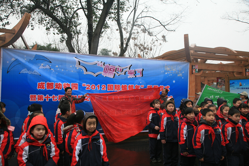 3月1日上午,成都动物园“2012国际蝙蝠年暨成都市第十七届科技之春”科普活动月启动仪式在成都动物园信息长廊广场正式揭幕。园内游客、动物爱好者、高校志愿者和成都市北新小学三年级同学们近100人参加了启动仪式。成都动物园园长王强、书记彭长明带领近20名职工也参加了启动仪式。