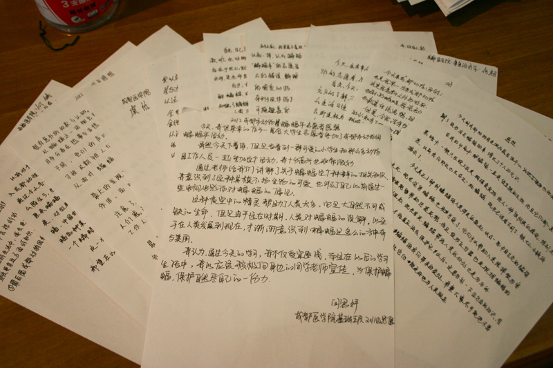 揭幕仪式后,在成都动物园科普馆和园会议室分别开展了丰富生动的“蝠来了——我来画蝙蝠”和“蝠来了——蝙蝠保护研讨会”活动。在“我来画蝙蝠”活动中,小学生们先观看了“国际蝙蝠年”成都动物园宣传片,从宣传片中初步了解了关于蝙蝠的信息,然后开始作画。他们在画画和感言中展现了今天对蝙蝠知识的收获,并表示要从自己做起来保护蝙蝠;“蝙蝠保护研讨会”则在高校志愿者之间展开。科教部的胡彦部长先为志愿者做了“蝠来了——蝙蝠专题讲座”,接着,志愿者们结合自己对蝙蝠的固有印象和获得的蝙蝠知识就以“为什么要保护蝙蝠?”和“怎样来保护蝙蝠?”为主题展开了激烈讨论,气氛尤其热烈。活动后大家都余兴未尽,纷纷表示参加这样的活动增进了他们对蝙蝠的认识,改变了以前的看法,也找到一些基本的方法来保护。整个活动在同学们欢乐的笑声中圆满结束。