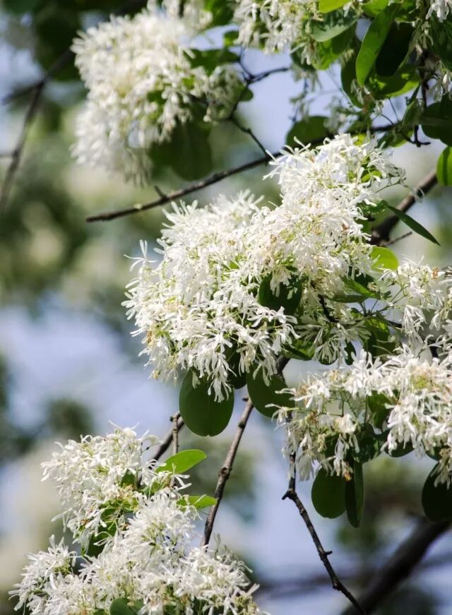 流苏树是落叶乔木,树形高大优美,枝叶茂盛,初夏满树白花,如覆霜盖雪,夺目耀眼,清丽宜人。