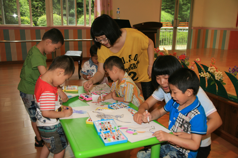 志愿者与孩子们一起填画出“美丽的金丝猴”